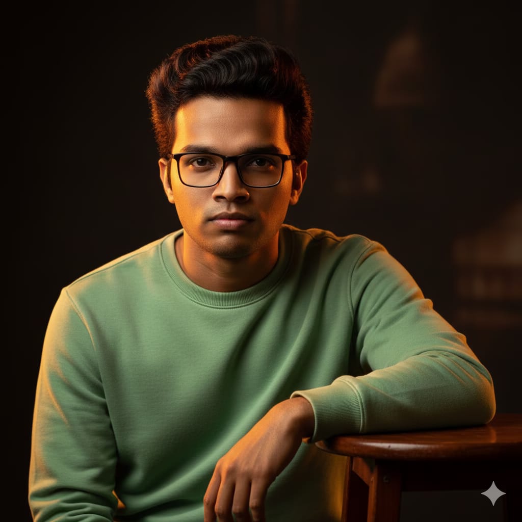 Create A hyper-realistic face of the uploaded person (preserve exact real face and body identity, no alterations) A stylish young man (Followed by given picture, face 100% unchanged) with voluminous, well-set same hair and posing confidently with one arm resting on the wooden Stool. He is wearing a light Green sweatshirt . wearing square stylish glass, The scene is lit with soft gold yellow and orange lighting, creating a cinematic and moody vibe. Dark background, high contrast, fashion editorial style, close-up portrait, soft shadows, dreamy aesthetic.