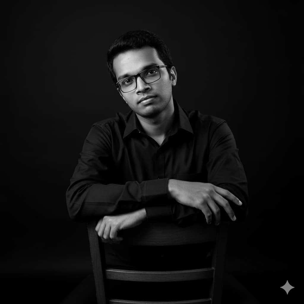 Make this a studio portrait. Adjust the skin tone and give it a cinematic black-and-white color grade. The man is wearing a black shirt and sitting on the back side of a chair. Change the photo angle from eye level. Use a black background. The photo should look realistic in 8K without any pixel loss.